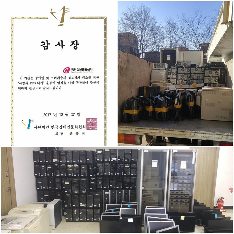 특허정보진흥센터(소장 이동근)는 지난 12월27일(수), 한국장애인문화협회의 '사랑의 PC보내기' 운동에 참여하여 노후사무기기 285대를 전달하였습니다.