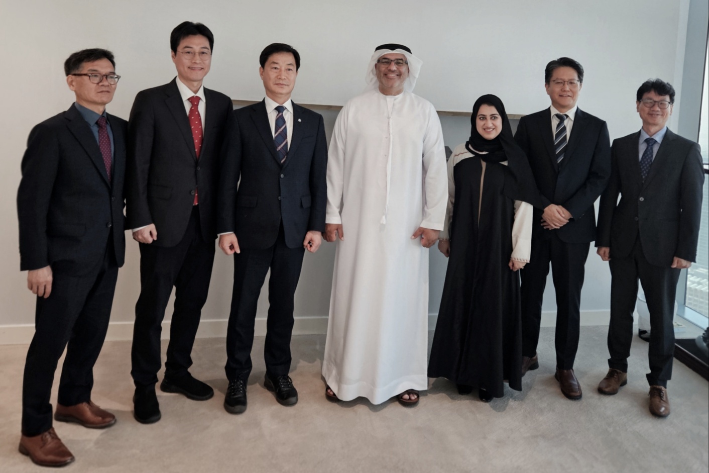 (왼쪽에서 세 번째 한국특허기술진흥원 김명섭원장, 왼쪽에서 4번째 UAE 경제관광부 차관보 압델라만 알무아이니, 왼쪽에서 5번째 마르와 하산 알하무디 과장)