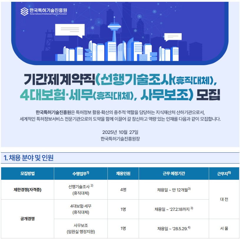 한국특허기술진흥원 기간제계약직(휴직대체 등) 채용 안내