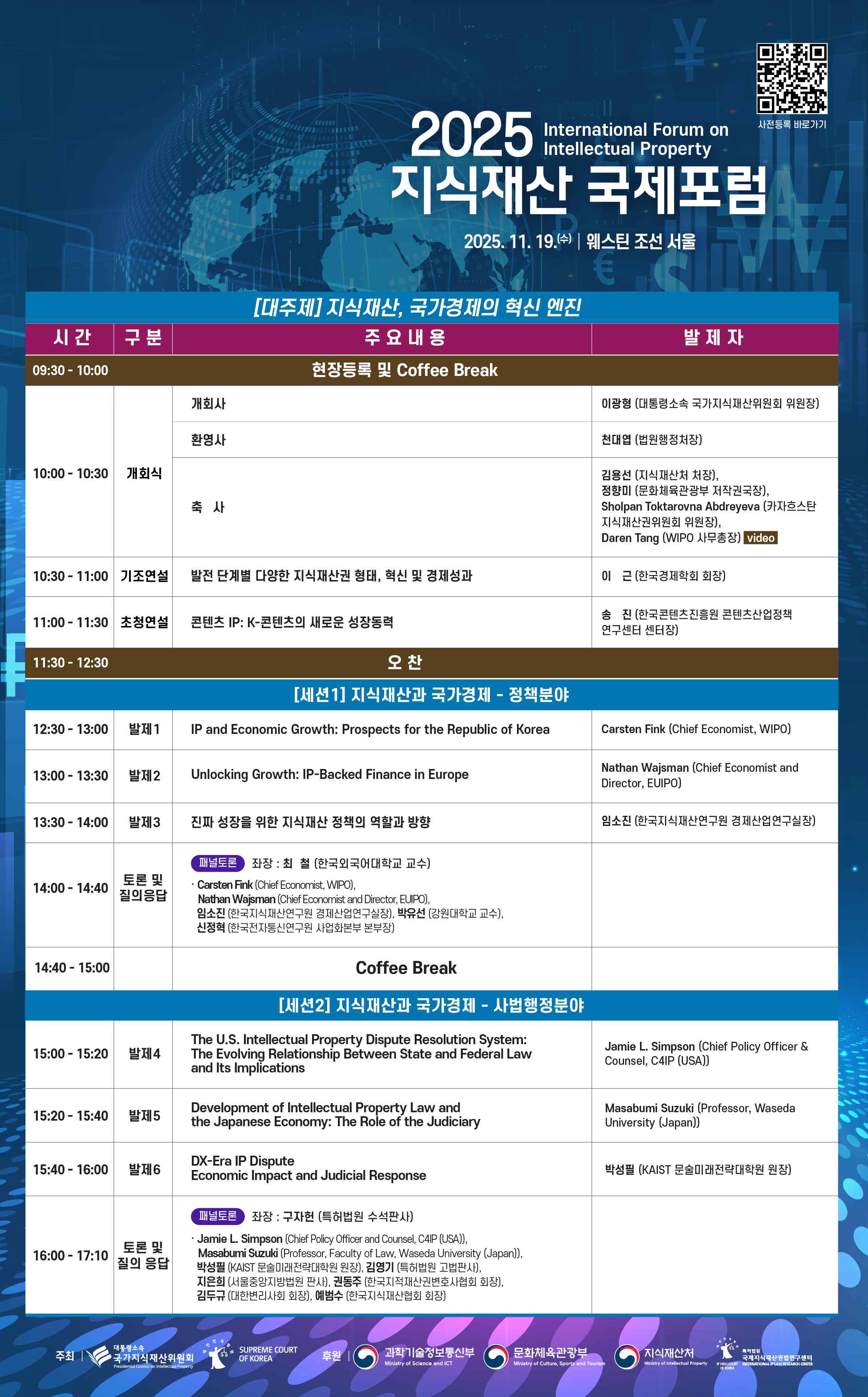 국가지식재산위원회(이하 '위원회')는 지식재산과 국가경제 성장 간의 긴밀한 관계를 살펴보고 향후 역할 및 발전 방향을 모색하고자 아래와 같이 '2025 지식재산 국제포럼'을 개최합니다.